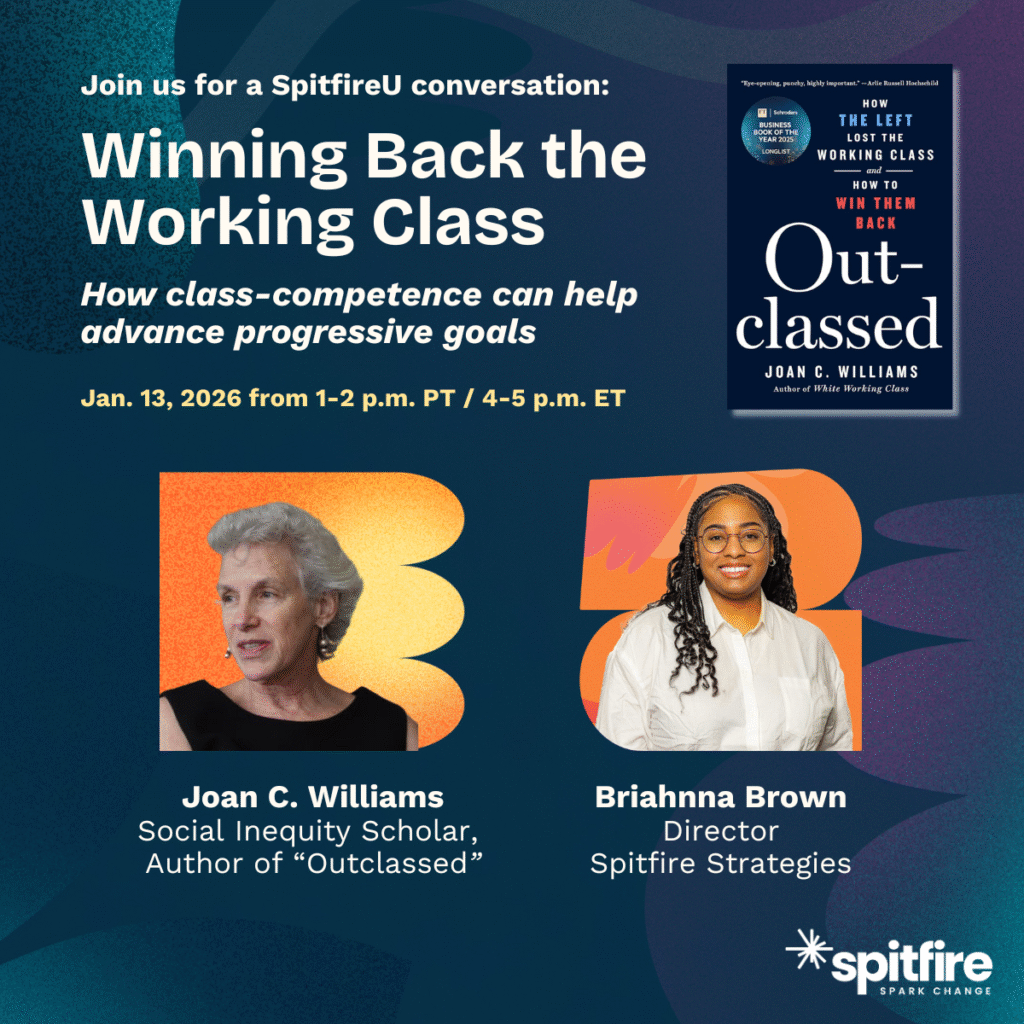 This SpitfireU session is part presentation and part interactive workshop. It’s an opportunity to reimagine how to forge or expand multiracial cross-class coalitions that change the nation for the better. Join us in this critical moment as you decide on your 2026 messaging strategy or prepare to launch your nonpartisan advocacy campaign.